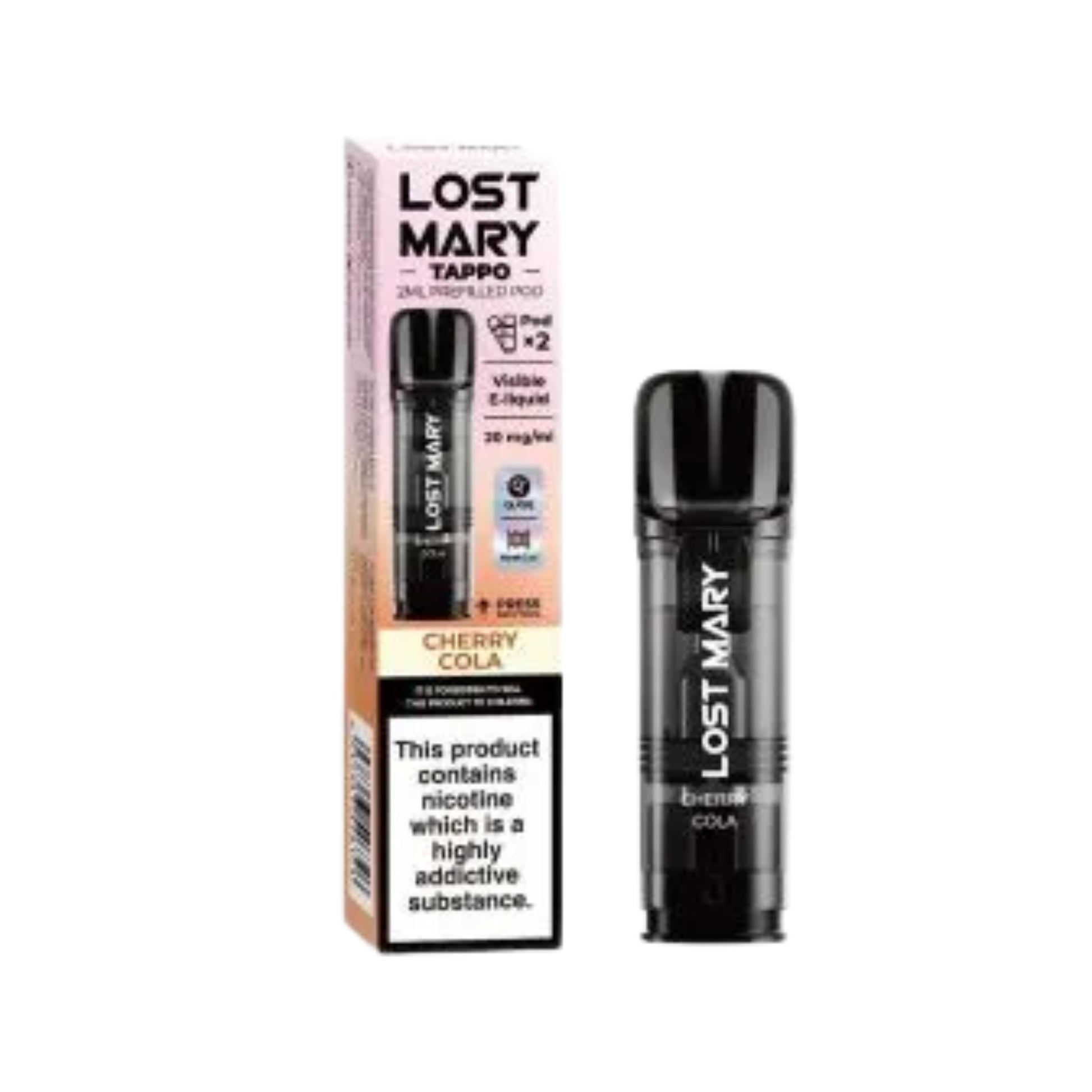 Uses prefilled pods: 2 mL e-liquid per pod, at 20 mg/mL (2 %) nicotine salt strength.