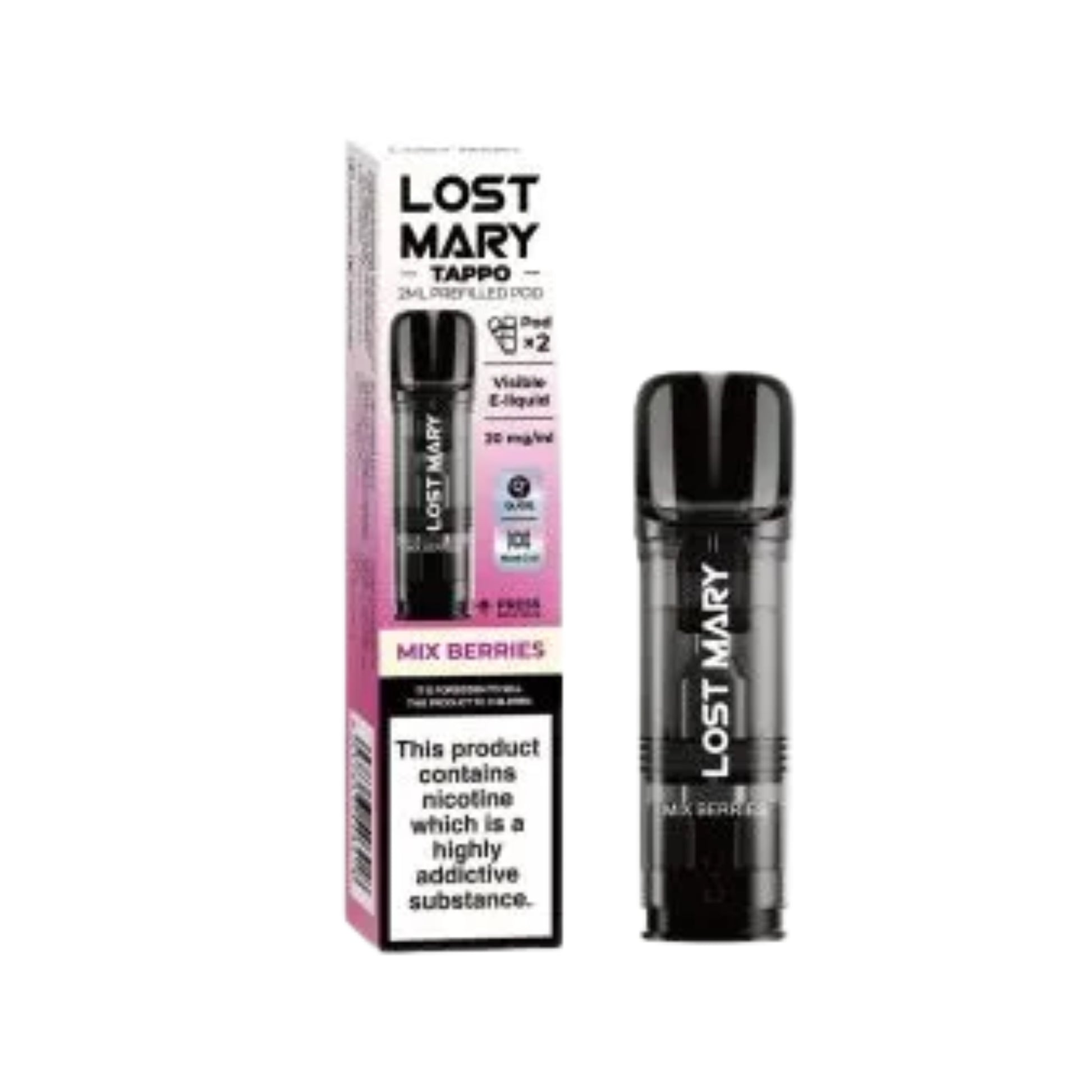 Uses prefilled pods: 2 mL e-liquid per pod, at 20 mg/mL (2 %) nicotine salt strength.