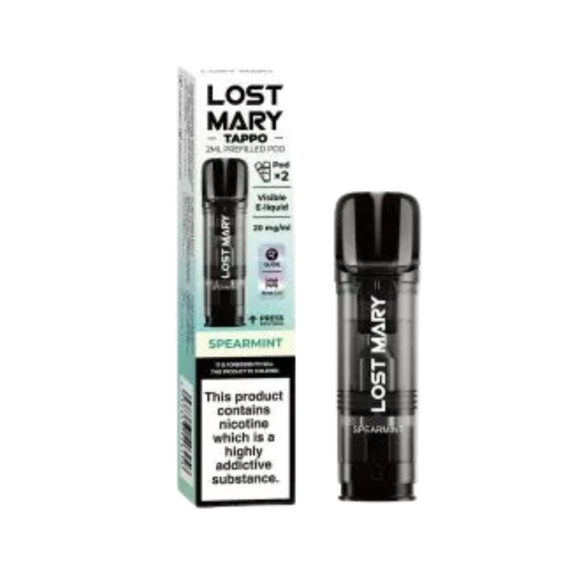 Uses prefilled pods: 2 mL e-liquid per pod, at 20 mg/mL (2 %) nicotine salt strength.